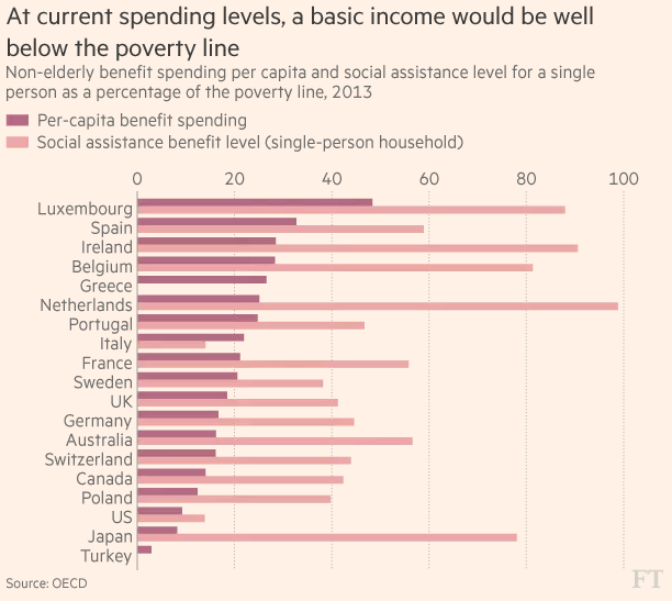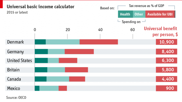 The cost to pay GBI: Some critics feel that paying for GBI would be cost prohibitive and could have more harm than good for a nation’s economy. For example, the Economist magazine projected that a nation the size of the United States would have to raise the share of GDP collected in taxes by almost 10 percent in order to give each individual, including children, an income of USD 10,000 annually. Critics charge that taxes must increase to pay for GBI and that it may actually mean a redistribution of wealth in society. These critics claim that such a redistribution would be unfair to those who took risks and succeeded in order to reach their level of success in society. According to a report by the Organization for Economic Co-operation (OECD), GBI would result in large tax increases, ineffective targeting of aid toward the poorest of society, and large numbers of winners and losers. The authors of the report, James Browne and Herwig Immervoll, state that GBI at even a meaningful level “would require tax rises as well as reductions in existing benefits and would often not be an effective tool for reducing income poverty.”